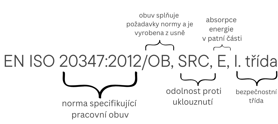 Naše modely mají certifikaci: EN ISO 20344:2011 a EN ISO 20347:2012/OB, SRC, E, I. třída. Všeobecné požadavky a zkušební metody stanovuje norma ČSN EN ISO 20344. Specifikovanější částí je druhá norma, EN ISO 20347:2012, která je určená pro pracovní obuv. OB za lomítkem znamená, že obuv splňuje základní požadavky normy a klasifikaci I. (tj. obuv z usní nebo jiných materiálů). Pracovní obuv se liší od ochranné a bezpečnostní obuvi tím, že nemá ochrannou špičku na ochranu před nárazem a stlačením. Další znaky SCR určují protiskluznosti podešve, ta je odolná proti uklouznutí na keramické podlahové dlaždici s SLS a na ocelové podlaze s glycerínem – tedy na nejvyšším možném stupni. Písmeno E pak značí dodatečnou specifikaci obuvi. Naše obuv tedy disponuje absorpcí energie v patní části a tím změkčuje došlap. Poslední částí je bezpečnostní třída ta specifikuje, že obuv není odolná proti propichu a nemá dezén na podešvi.