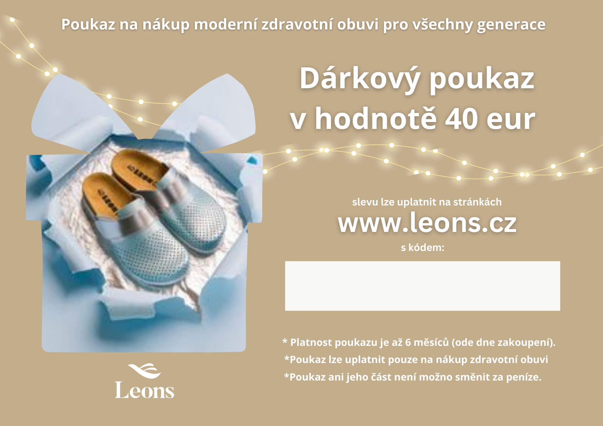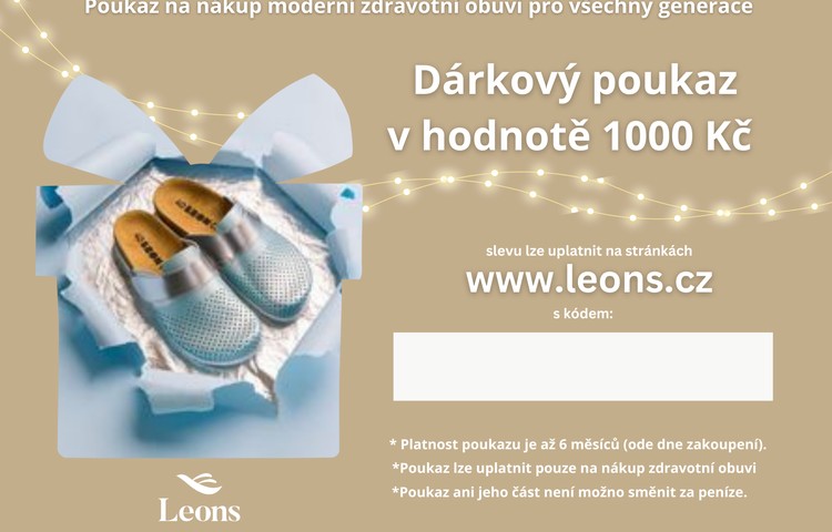 Všechno jste probrali horem dolem a nejste si jistí? Nevadí, darujte voucher na zdravotní obuv Leons, vhodnou na problematické nohy všech typů. Ať si obdarovaný vybere, co se mu líbí.Na přání můžeme také doplnit dárkový poukaz s osobním věnováním, stačí nám na email s číslem objednávky sdělit text Vašeho blahopřání :) Dárkový poukaz vám zašleme elektronicky na e-mail.